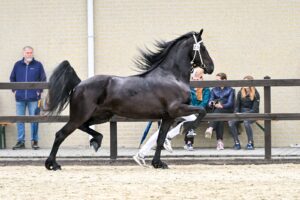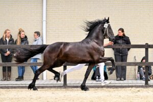 In de laatste rubriek driejarige merries stond Ulrieke fan H.M.V. op kop. ‘Een merrie met veel statuur en front en veel kwaliteit in het beenwerk’, beschreef Manuel Gasseling de merrie van Friesenstal H.M.V uit Olst. ‘Ze draaft met veel balans en ‘hoog van de vloer’ zoals we dat noemen, met veel zweefmoment.’ Achter Ulrieke stonden Uilkje fan ‘e Alde Ryd Ster (Omer 493 x Jehannes 484) en Trynke Ster (Wibout 511 x Jehannes 484) beiden met een Ster tweede premie.