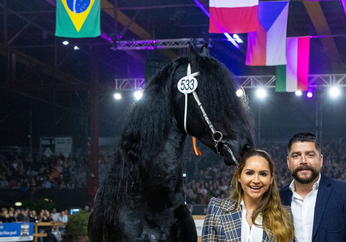 Begin vorig jaar vertrok de 6-jarige Dedmer 519 AAA (Alwin 469) naar Finca Sanro in Mexico. Afgelopen zomer vloog leeftijdsgenoot Beant 517 Sport AAA (Hessel 480) zijn nieuwe stalgenoot achterna. En dan werd tijdens de Hengstenkeuring 2023 bekend dat de eind vorig jaar goedgekeurde, 4-jarige Jimte 533 AA (Ulbrân 502) naar hetzelfde adres in Mexico zal verhuizen nadat hij een seizoen in Nederland heeft gedekt. De nieuwe eigenaren van het trio dekhengsten zijn Jonathan Robles en Sandra Sanchez van Finca Sanro. Deze ambitieuze liefhebbers van het Friese paard bezochten dit jaar voor het eerst de Hengstenkeuring en waren zeer onder de indruk. ‘Het was geweldig om mee te maken. Het is helemaal nieuw voor ons, dit hadden we niet verwacht. Volgend jaar komen we graag terug’, vertelt Jonathan.