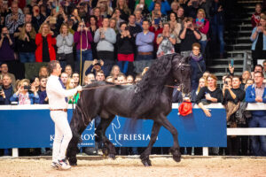 Applaus, tranen, kippenvel…alle denkbare emoties kwamen eraan te pas toen Jasper 366 met zonen, kleinzonen en achterkleinzonen in de ring verscheen. Het leverde een indrukwekkend plaatje op: Jasper met daarachter Beart 411, Haitse 425 en Maeije 440, kleinzonen Pier 448, Bikkel 470, Epke 474 en Siert 499 en achterkleinzoon Jouwe 485.
