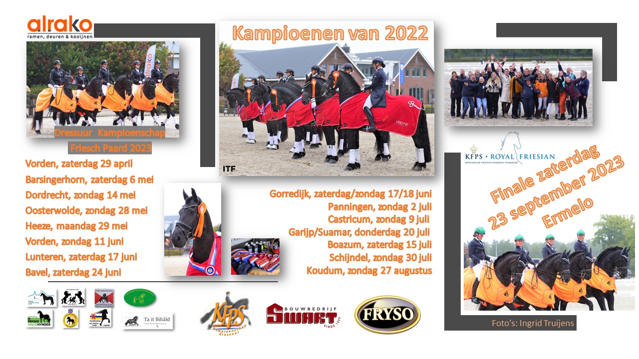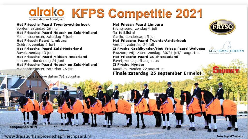 Het Nederlands kampioenschap Fries paard heeft de data van de 16 selectiewedstrijden op de agenda gezet. En ook de finale van het Alrako KFPS dressuur kampioenschap staat!