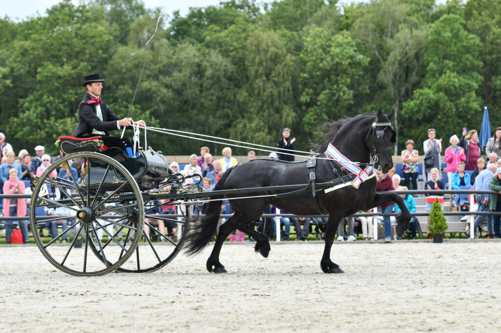 Sybren Minkema bracht Auckje een aantal keren in het tuig uit bij het kampioenschap voor fokmerries. ‘In de tuigsport komen de kwaliteiten van Auckje het best tot uiting’, aldus Rob Lemstra. ‘Auckje is een dame met een eigen wil, dat karakter is voor in de dressuur niet altijd handig, maar dat felle kun je in het tuigen goed gebruiken.’