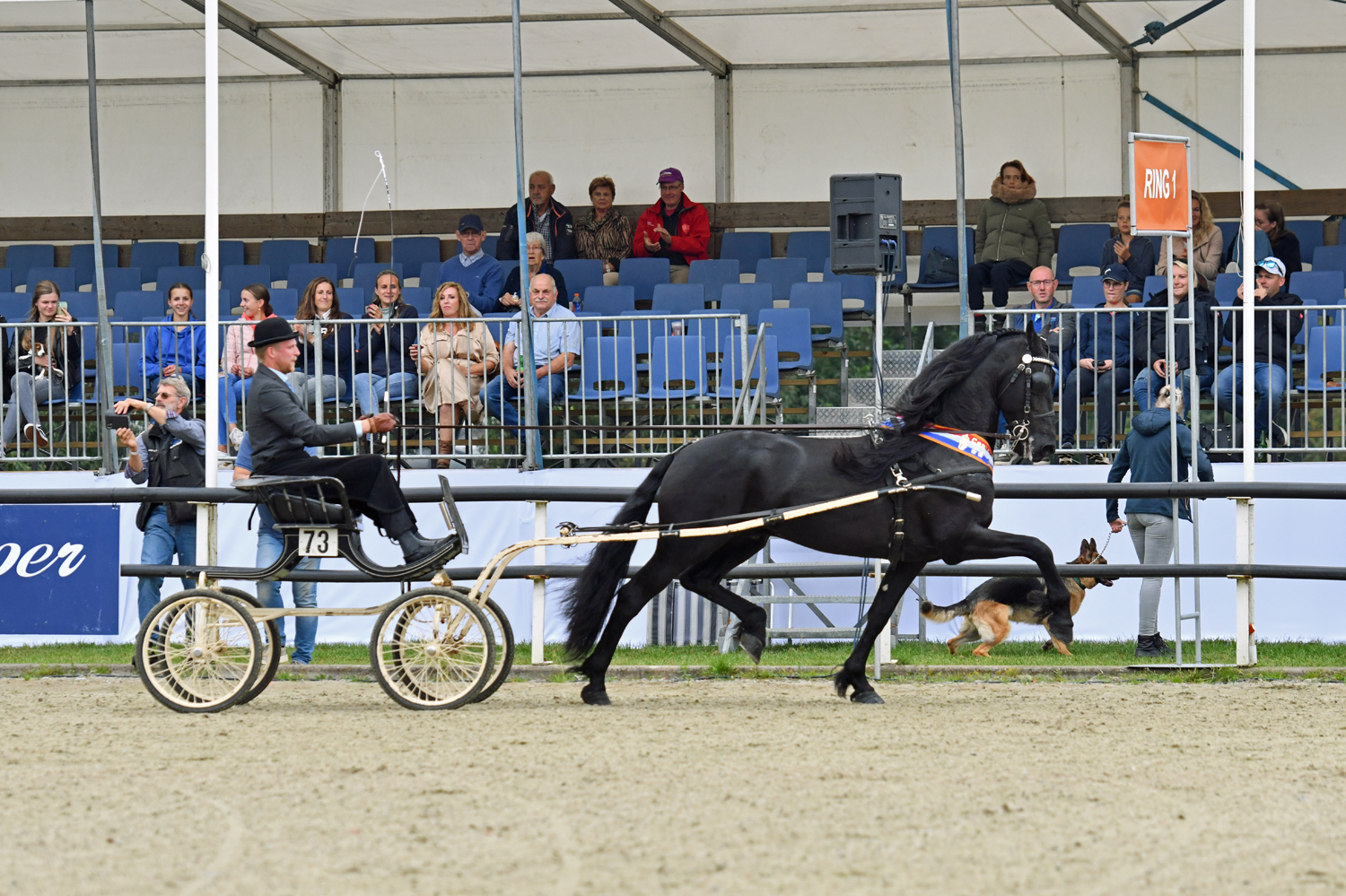 Normaliter rijdt Kenna Bakker dressuur met de nakomeling van Jouwe 485, maar de amazone is momenteel op vakantie. ‘Dus ik dacht; ik pak mijn kans en haal hem uit het hok’, vertelt Tsjalling de Boer tijdens de prijsuitreiking. Er deden in totaal vier combinaties mee met de tuigklasse die een open inschrijving kende. Tussen alle heren zat er één dame aan het stuur: Ria Hettinga reed Allure RSH Ster (Tsjalle 454 x Brend 413) netjes en fanatiek door de baan maar mocht helaas niet overrijden, net zoals Marcel Heuker met Willem fan ’t Hakkevelt Ster Sport AA (Hette 481 x Maurus 441), Heukers BV Willem, die zowel in het tuig als onder het zadel zich opmerkelijk heeft laten zien dit seizoen.