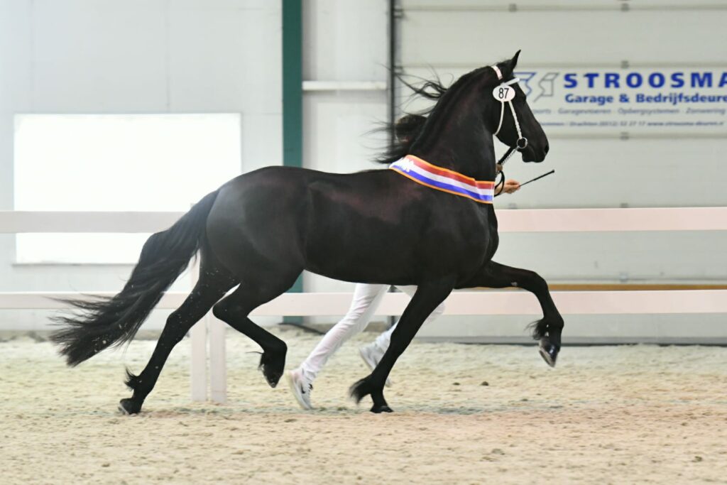 ‘We hebben een heel sterk en kwaliteitsvol seizoen gehad’, begon jurylid Jan Hellinx zijn beoordeling van de kampioenskeuring. ‘Deze kwaliteit werd vandaag ook bevestigd, want we hebben echt hele goede paarden in de ring gezien.’ Het was Berber van Brabantshof, gefokt door Jan en Annie Vernooij uit Beusichem en in eigendom van Arno Thomassen uit Lunteren, die uiteindelijk dankzij haar rastype, langgelijnde exterieur en uitmuntende beweging er met de allerhoogste eer vandoor ging.