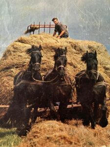 Even terug naar hooi maken anno 1966. De fokmerries werkten op het land net zoals een enkele ruin. En de veulens? Die gingen mee. Breng je kind mee naar het werk, elke dag. Voor het maaien van het gras werd een dubbelspan paarden gebruikt. Een span in de morgen en een ‘vers’ span in de middag.