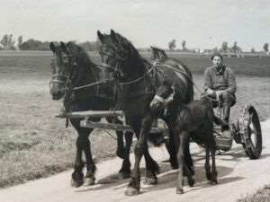 Dit brengt mij terug in de tijd die ik ken van verhalen van mijn ouders, grootouders en krantenknipsels over mijn grootvader (pake). Zolang pake boer was (1942-1978) werd al het werk op zijn 71 hectare grote melkveehouderij met Friese paarden gedaan. Een trekker kwam bij pake niet op het erf. Een dood ding, aldus pake. Hij hield van het werken met de paarden. Het levensbloed van de boerderij.