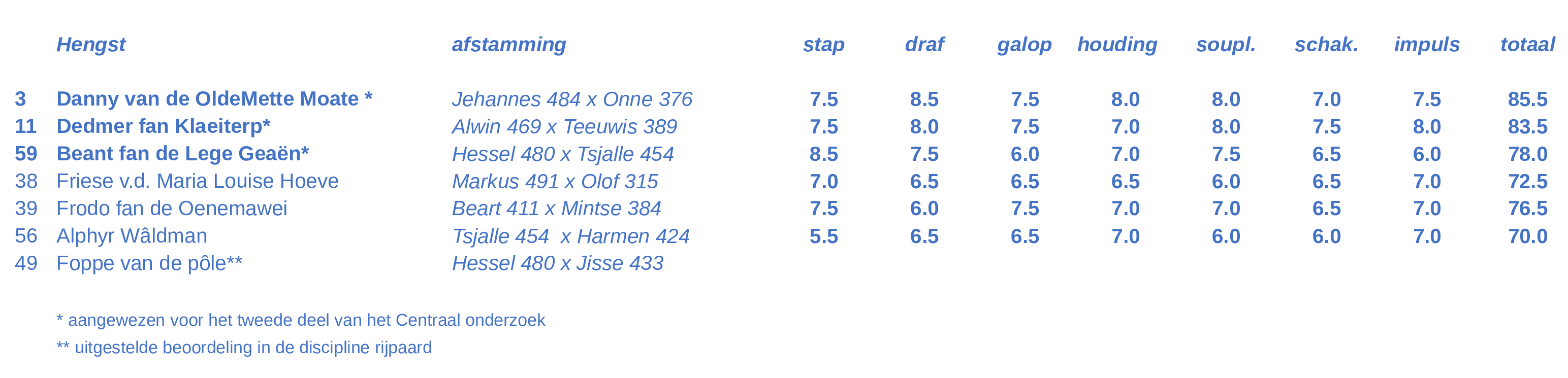 Tijdens de eindbeoordeling vandaag zijn 3 hengsten aangewezen voor het tweede deel van het Centraal onderzoek in de aangespannen disciplines. Hiermee zijn er nog 4 hengsten in de race voor inschrijving in het stamboekregister. De hengst Foppe van de Pôle zal over twee weken een uitgestelde eindbeoordeling gaan krijgen. Deze hengst werd tijdens de nalevering ingecheckt, twee weken na de reguliere aanlevering. Uiteindelijk liepen 6 hengsten de eindbeoordeling, nadat ook de hengst Ernst K. (Markus 491 x Rindert 406) was teruggetrokken. De resultaten