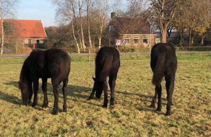 Nine, Maike en Nynke zijn nu dus ook weer ontwormd met Equest. Het was totaal geen probleem, inmiddels kennen ze dit en vinden ze het eerder lekker dan vervelend. Afgelopen week was het ook weer tijd voor de hoefsmid, de hoefjes zien er heel goed uit maar toch is het belangrijk om ook naar de onderkant te kijken zodat de veulens niet scheef komen te staan. De buitenkant was mooi afgesleten maar de onderkant moest wel bijgewerkt worden. Voorlopig zijn ze weer helemaal netjes en hebben ze zeeën van tijd om kattenkwaad uit te halen.. Nine is gek op dingen beetpakken en is inmiddels een waar fotomodel aan het worden. Zo zag ik haar van de week voorbij komen op Instagram bij Tweespan Ruitersport, terwijl Maaike had bedacht dat het gras aan de andere kant van het draadje er toch veel lekkerder uit zag en zich als een volleerd limbo-danseres onder het draad door bewoog. Maar na een paar happen wil ze dan toch wel weer liever bij Nine en Nynke zijn, maar hoe? Altijd zo grappig om te zien, ze weten heel goed hoe ze ergens uit moeten komen, maar de weg terug lijkt bijna hogere wiskunde. En Nynke, die kijkt het allemaal aan, wat een lief dier. Het blijft genieten om ze zo te zien. Hoe zullen ze er over een maand weer uit zien? En straks als er sneeuw ligt, wat zal dat leuk zijn voor het eerst in de sneeuw. Ik blijf dromen over die sneeuw.. Hessel zei nog ‘Es, we hebben al jaren geen strenge winter meer gehad.’ We wachten af. Ik glimlachte. Dan maken we wieltjes onder de slee, maar we gaan rijden!