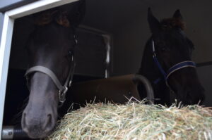 Hessel had de trailer buiten klaar gezet. Voorin de trailer hadden we weer pakken hooi gelegd zodat de veulens niet onder de voorste stang konden duiken of erover heen konden komen. Zouden ze wel over de stang komen dan komen ze met hun voorbenen op de pakken hooi en dat is niet erg. Daarnaast fungeert deze afzetting voor in de trailer ook nog als “hooinet” en is het deurtje voor in de trailer mooi afgezet. De pakken hooi laten we bij de opfok achter zodat ze de eerste dagen hooi krijgen wat ze kennen. Veulens zijn gevoelig op de maag en helemaal tijdens stress situaties dus doen we dit zo. Alle stangen blijven verder zitten zoals ze altijd zitten. De veulens gaan los op de trailer. Als eerste hebben we Nine erop gezet. Wij doen het altijd zo dat één met het veulen loopt en de ander loopt met de merrie erachter aan. Ik liep voorop met Nine en Berber met Nanja er achter aan. Nine liep er makkelijk op, ze kreeg nog een zetje van Hessel en daar stond ze. Ondertussen was Maike ook al onderweg, die sputterde iets meer tegen maar na een paar minuten stond ook zij. Toen direct de klep dicht en het zeil natuurlijk, zodat de trailer helemaal dicht was. De merries hebben we weer op stal teruggezet. Voor de afleiding heb ik ze een beetje brok gegeven en natuurlijk voldoende ruwvoer. De merries krijgen nu geen krachtvoer meer. Dit heeft te maken met de melkproductie. Het uier van de merrie moet opdrogen als het veulen erbij weg is, dit kan je bevorderen door geen krachtvoer te geven.