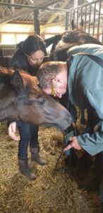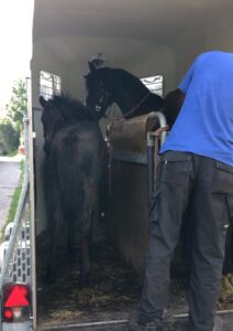 De volgende dag, zaterdagmorgen zijn we in alle vroegte naar Stal de Mersken gegaan. Nanja loopt altijd zo de trailer op en Nine doet al precies hetzelfde. In de trailer staat Nanja vast en Nine los. De voorste stang in de trailer voor Nine halen we eruit zodat het veulen niet over de stang kan komen. In de “punt” van de trailer, dus voor merrie en veulen stapelen we 3 grote pakken hooi op elkaar. Zo kan het veulen niet in de punt terecht komen tijdens plotseling remmen of dat het op onderzoek uitgaat in de trailer. Tevens dient het direct als vervanger voor het hooinet zodat merrie en veulen lekker kunnen eten onderweg. Maar goed eenmaal aangekomen bij de “drive-in” spermabank bij Stal de Mersken was Ulbrân al druk bezig om ons te voorzien van een buisje onverdund sperma. Nanja en veulen bleven mooi op de trailer staan. Het sperma werd opgevangen en binnen een paar tellen bij Nanja ingebracht op de trailer. Na een kop koffie konden we weer gaan, geweldig toch.