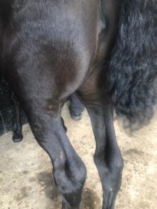 Maar dat was niet het enige… We hebben de merries met veulens in het land gescheiden lopen van de ruinen. Er staat dubbele lijn met een meter tussenruimte én stroom. Aan de lijnen hangen om de paar meter witte draden zodat de paarden de lijnen goed zien. De merries met veulens lopen jammer genoeg niet bij elkaar omdat onze merrie Roza nogal fel uithaalde naar Nine, het veulen van Nanja. Maar Nanja was hengstig dus die liep steeds te paraderen langs de lijn en te lonken naar de ruinen. En ja hoor, ze ging dwars door het draad heen! Tot mijn verbazing liep Nanja rustig met haar veulen te grazen en waren het juist de ruinen die er een soort van speelkwartier van gemaakt hadden. Hierna hebben we besloten om de merries met veulens toch maar weer bij elkaar in het land te zetten. Wel spannend, maar het is wel het mooiste en het beste, ook voor de opvoeding van de veulens. En het gaat goed! De veulens zijn inmiddels ouder en de merries daardoor minder beschermend. Ook hebben ze nu beiden het bekende kale plekje net boven de hak, dit komt door het slaan van de staart tegen de vliegen. Let er maar eens op, alle veulens hebben dit kale plekje op dezelfde plek. Het is zo leuk om ze nu samen te zien: ze rennen, spelen en ik kan ze nu tegelijk knuffelen.