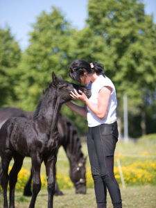 Is het alweer vrijdag? Pfff wat vliegt de week voorbij, helemaal nu het allemaal spannend begint te worden nu onze Roza bijna moet veulenen. Vorige week zei Hessel tegen mij: ‘Es, ik denk dat ik samen met Henny (zijn vrouw) nog een even een weekendje weg ga, het wordt prachtig weer en het is Pinksteren dus kunnen we er mooi een lang weekend van maken.’ Ik zei: ‘jullie hebben helemaal gelijk, hier is alles rustig en Roza moet toch pas 9 juni veulenen.’ Hessel vertrok afgelopen vrijdag en Berber en ik zorgden dat alles doordraaide op stal. Zaterdag kwam Maureen Cohen met haar vriendin Mia onze kleine Nine NP fan de “Hesterhoeve” bewonderen. Maureen is fotografe dus ze waren nog niet binnen of ze lag al languit in het gras om foto’s van Nine te maken. Nine is inmiddels alweer drie weken oud en vindt alle aandacht prachtig. Het is echt een aanhankelijk, nieuwsgierig veulen en totaal niet bang. Dit komt natuurlijk omdat ik haar vanaf dag één al ‘plat’ geknuffeld heb.