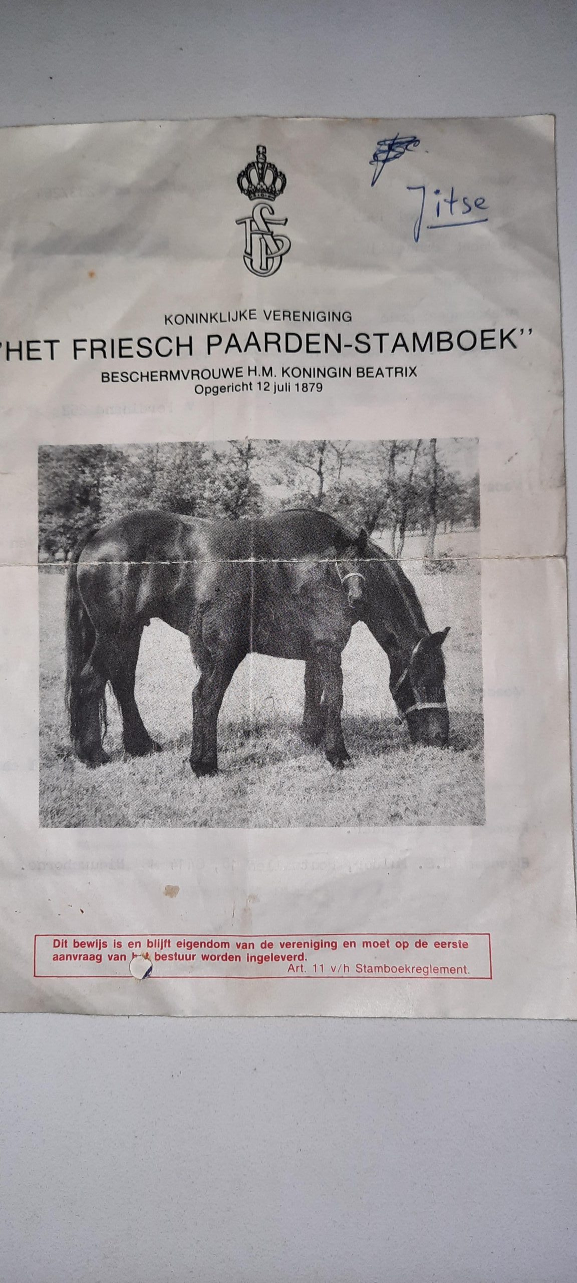 Binnen maakte ik snel een kop thee om weer een beetje op te warmen. Mijn blik ging naar de tafel. Ik zag daar een heel oud stamboekpapier liggen. Het papier was van Jitse, een Friese hengst, geboren op 5 mei 1985 en door Hessel gekocht toen hij 4 jaar oud was. Grappig om te zien. Ik bestudeerde het papier en zag ineens rechts staan ‘Tong nr: 244 F 85’ en ‘Brandmerk F’. Een tongnummer en de voorloper daarvan was getatoeëerd aan de binnenkant van de lip. Maar hier werd veel mee gefraudeerd, het gebeurde dat het nummer zelfstandig door eigenaren werd weggesneden zodat het paard niet meer aan het nummer te herkennen was. Dan werd het met een vals, beter papier verkocht voor veel geld. Gelukkig is dat niet meer van deze tijd en worden alle paarden nu voorzien van een chip in de hals. Maar denk dat ik het toch eens na ga vragen bij Hessel. Hij kan daar vast mooi over vertellen…..