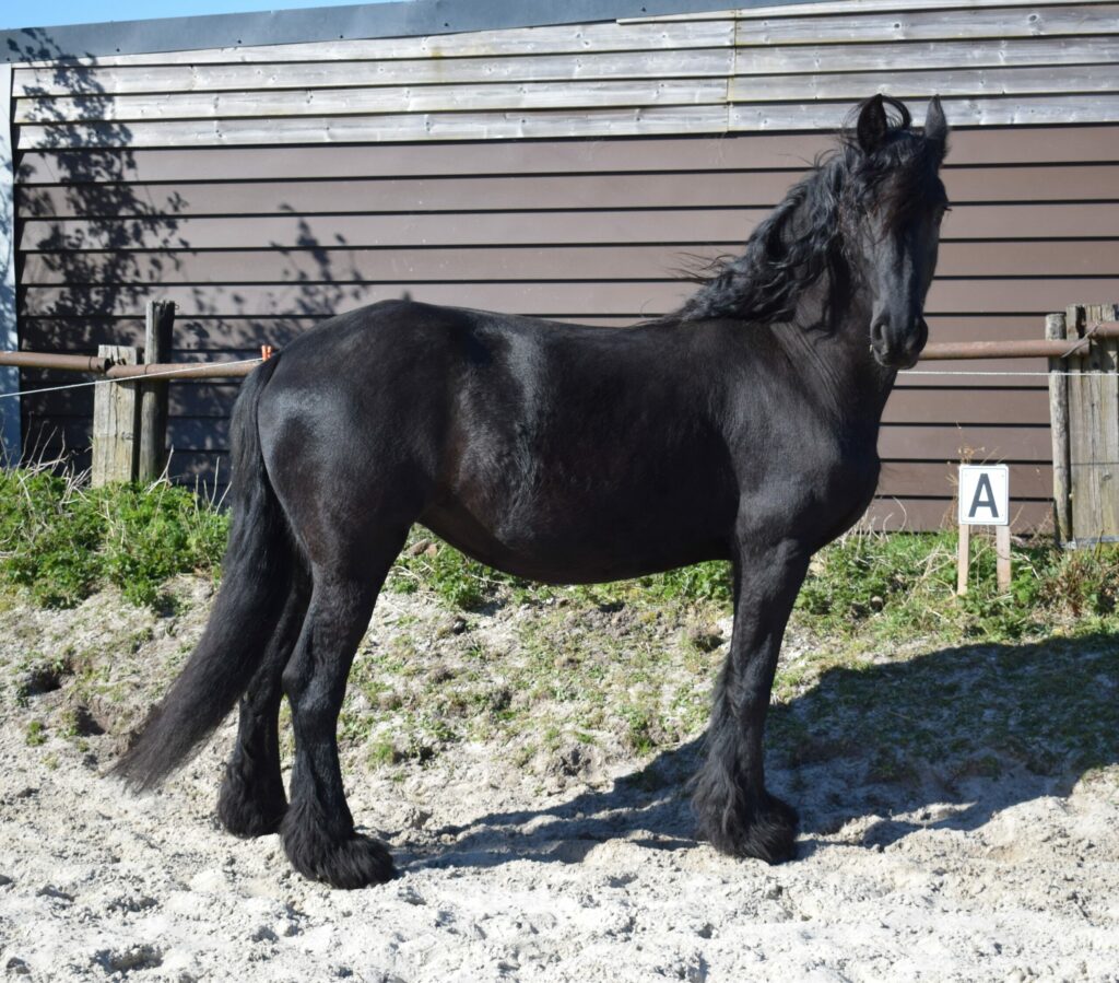 Afgelopen zondag was het dan eindelijk zover, de nieuwe Friese merrieveulens Nina en Nynke zijn gearriveerd. Nina en Nynke zijn twee prachtige veulens die ook net als onze Nine en Maike steeds samen hebben gelopen dus die kennen elkaar ook goed. Zondagmorgen omstreeks 11.00 uur kwamen de eigenaren aanrijden met de veulens. Nine en Maike waren natuurlijk direct geïnteresseerd en stonden vol verwachting achter het hek te kijken wat er aan kwam. Ze kennen natuurlijk alleen elkaar en hun moeders, die ene keer dat ze andere veulens hebben gezien tijdens de keuring kan je niet echt meetellen. Ik zag dat ze het ondanks dat ze super nieuwsgierig waren ook best spannend vonden net als ik. Het is toch altijd even weer afwachten hoe het loopt als er veulens bij komen. We hadden ervoor gekozen om de veulens direct bij Nine en Maike in het land te doen, het land is groot genoeg voor vier veulens om met elkaar kennis te maken. Mocht het niet klikken dan is er voldoende ruimte.