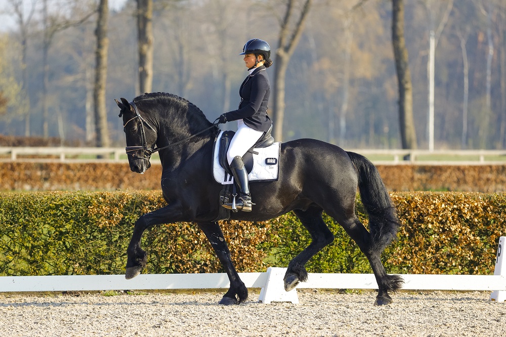 De instructrice merkte wel verschillen tussen het trainen van de KWPN’ers en Friezen. ‘Toen ik begon had ik niet heel veel ervaring met Friezen omdat ik zelf nooit een Fries had gereden, maar gaandeweg ben ik er achter gekomen dat je hun training wel iets anders aan moet pakken. Zo verzuren hun spieren iets sneller, waardoor je wat vaker stap-pauzes en ontspanmomenten moet inlassen. Het is iets systematischer lesgeven. Qua karakter zijn ze vaak wat makkelijk en liever’, vervolgt Oudhof lachend. ‘Ze zijn vaak gemotiveerd en doen het voor hun amazones, maar ik heb nog geen voorkeur wat lesgeven betreft.’