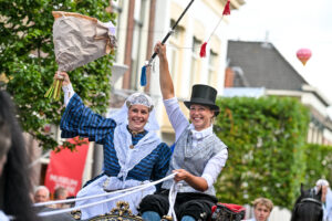 De Grietman (een voorloper van een burgemeester) voltrok de huwelijksplechtigheid zoals dat rond 1850 bij de boerenstand in Friesland gedaan werd. De Grietman spreekt: “Vandaag op de boerebrulloft is het Friese paard een belangrijke deelnemer, mede omdat het Friese paard dit bruidspaar bij elkaar heeft gebracht. Vroeger werd dit paard geprezen om haar kwaliteiten als rijpaard, als koetspaard en harddraver. En ook voor het boerenwerk was het een geschikt paard. Rond 1800 begon de export van het Friese paard. Zowel naar andere provincies, alsook naar het buitenland. Sommige fokkers voerden het paard karnemelk en eieren omdat dan de huid meer glansde en de prijs dan hoger was. Tussen 1800 en 1850 waren er 2847 draverijwedstrijden met oa de Friese paarden. Dat betekende een gemiddelde van 60 keer per jaar. Men heeft dit berekend aan de hand van de advertenties in de kranten. Overal waren er wegen die de naam kregen van ‘hurddraversdyk’, zo ook in Joure. En vanmiddag is er een harddraverij in de Midstraat van Joure. Het bruidspaar heeft ook liefde voor Friese paarden. Anne heeft vier eigen paarden en Agatha heeft haar eigen paarden. Agatha is geboren op een boerderij in Boornzwaag. Zij heeft een aantal jaren een kinderopvang gehad en is nu werkzaam in het onderwijs. Anne is geboren op de boerderij waar hij nog woont aan de rand van Sneek. Daar had hij een melkveebedrijf. In 2021 heeft hij dit veranderd in een pensionstal voor paarden. Naast zijn eigen paarden lopen er nu zo’n dertig pensionpaarden. In december 2021 kwamen Anne en Agatha via een vriendin van Agatha met elkaar in contact doordat de dames op de pensionstal een paard verzorgden. Agatha kwam steeds vaker op stal en eind januari 2022 tijdens een nieuwjaarsborrel op de pensionstal werd de eerste kus uitgedeeld. Het klikte tussen hen en later gingen ze samenwonen op de boerderij van Anne. Vandaag trouwen ze op de boerenbruiloft.”