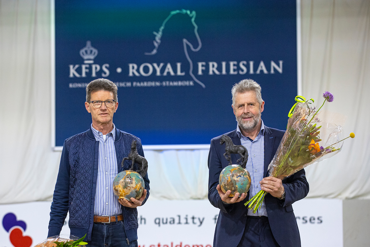 Bijna 40 jaar legden Harrie Draaijer en Jaap Boersma hun ziel en zaligheid in de fokkerij van het Friese paard, toegewijd, gedreven en buitengewoon deskundig verdienen ze alle lof. Op deze zaterdag was het moment om ze in de schijnwerpers te zetten. De laatste jaren vormden ze samen met Frenk Jespers als drie-eenheid de hengstenkeuringscommissie. In al die jaren keuren hebben ze het Friese paard luxer én beter bewegend zien worden. Bert de Ruijter zei het treffend: ‘de bolhoed af voor Harrie en Jaap.’