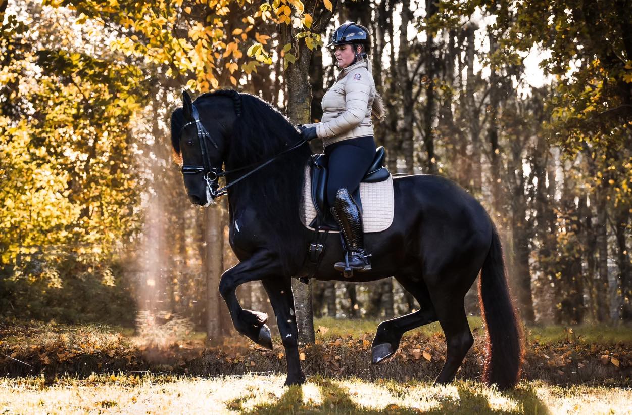 De inmiddels 15-jarige hengst heeft er sinds kort een amazone bij. Britt vertelt: ‘Wytske Schuth, die altijd bij mij in de kapsalon komt, liet weten dat ze heel graag Grand Prix wil rijden om vervolgens aan haar opleiding tot jurylid tot en met het hoogste niveau te beginnen. Toen zei ik eigenlijk heel spontaan: “Dan pak je Hebben toch!” Het is geweldig dat het tussen die twee goed werkt. Wytske heeft nog nooit met een Fries paard gereden, maar ze kon hem zo overnemen en startte al snel op haar eerste wedstrijd. Nu nog in de Lichte Tour, maar ze gaat als een speer, dus dat GP-startbewijs is in zicht!’