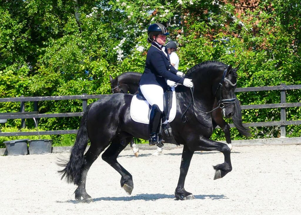 Britt rijdt meer Friese paarden, waaronder It Britt’s Hebbe (Olgert 445) en met Thomas fan ’t Wegje (Maurits 437). ‘Hebbe was mijn eerste Fries. Met hem start ik nu U25. Op de piaffe en passage scoren we hoog, alleen de éners zijn nog een dingetje. Daar komt nu wel meer rust in. Hij is heel heet, maar gelukkig wordt alles nu meer bevestigd en beheerster. We kochten hem toen hij vijf was. Vier jaar later loopt hij dus U25. Dat is best snel. Zeker voor een Fries.’