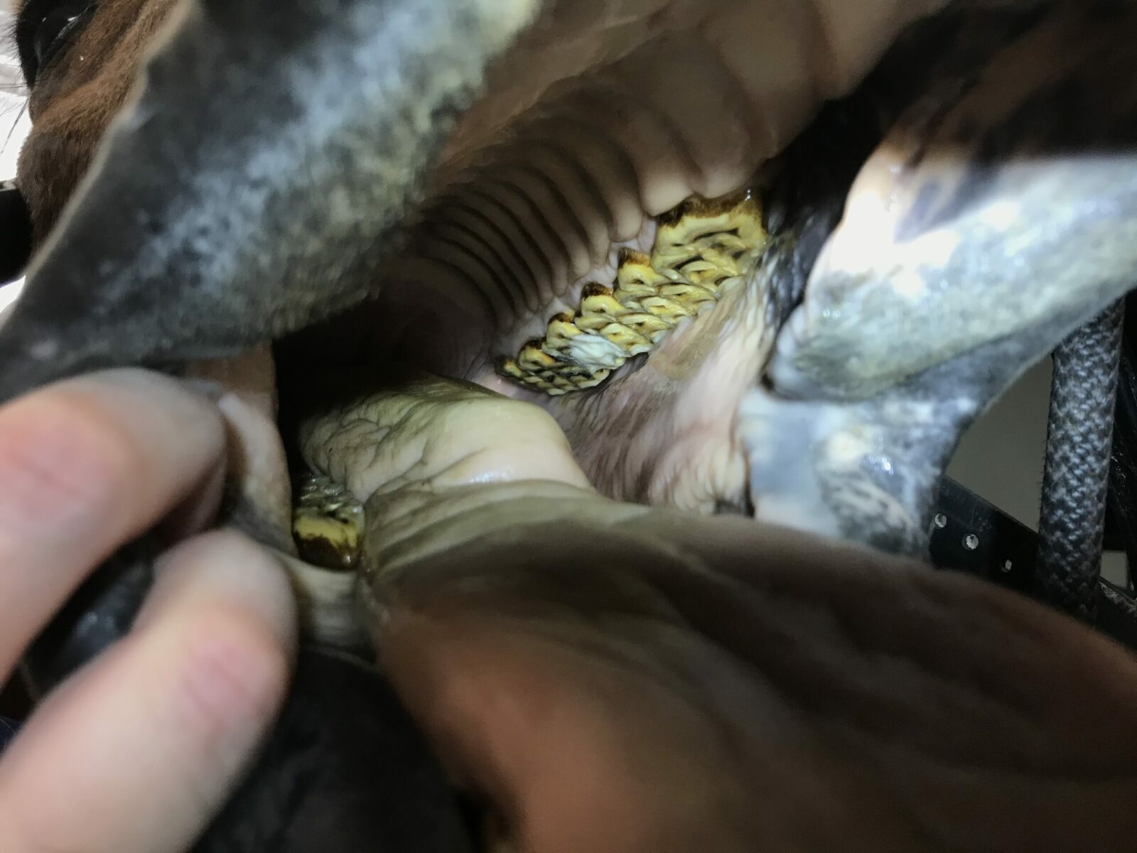Het behandelen van de infundibulae bestaat uit schoonmaken en vullen. ‘Dit is monnikenwerk,’ zegt Anne, ‘Infundibulae kunnen bij een wat jonger paard wel 70-80 mm diep zijn, enkele millimeters breed en hebben een grillige vorm. Bij cariës zijn ze vaak tot aan de wortel gevuld met aangestampte restjes voer. Daarbij komt dat ik er niet recht van boven bij kan, maar altijd onder een hoek van 90 graden aan het werk ben omdat een paard zijn mond niet zover kan opensperren als een mens of hond/kat. Dit alles maakt het een klus voor op de kliniek waar de omstandigheden goed zijn en de juiste spullen voor handen zijn’.