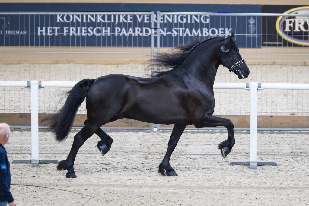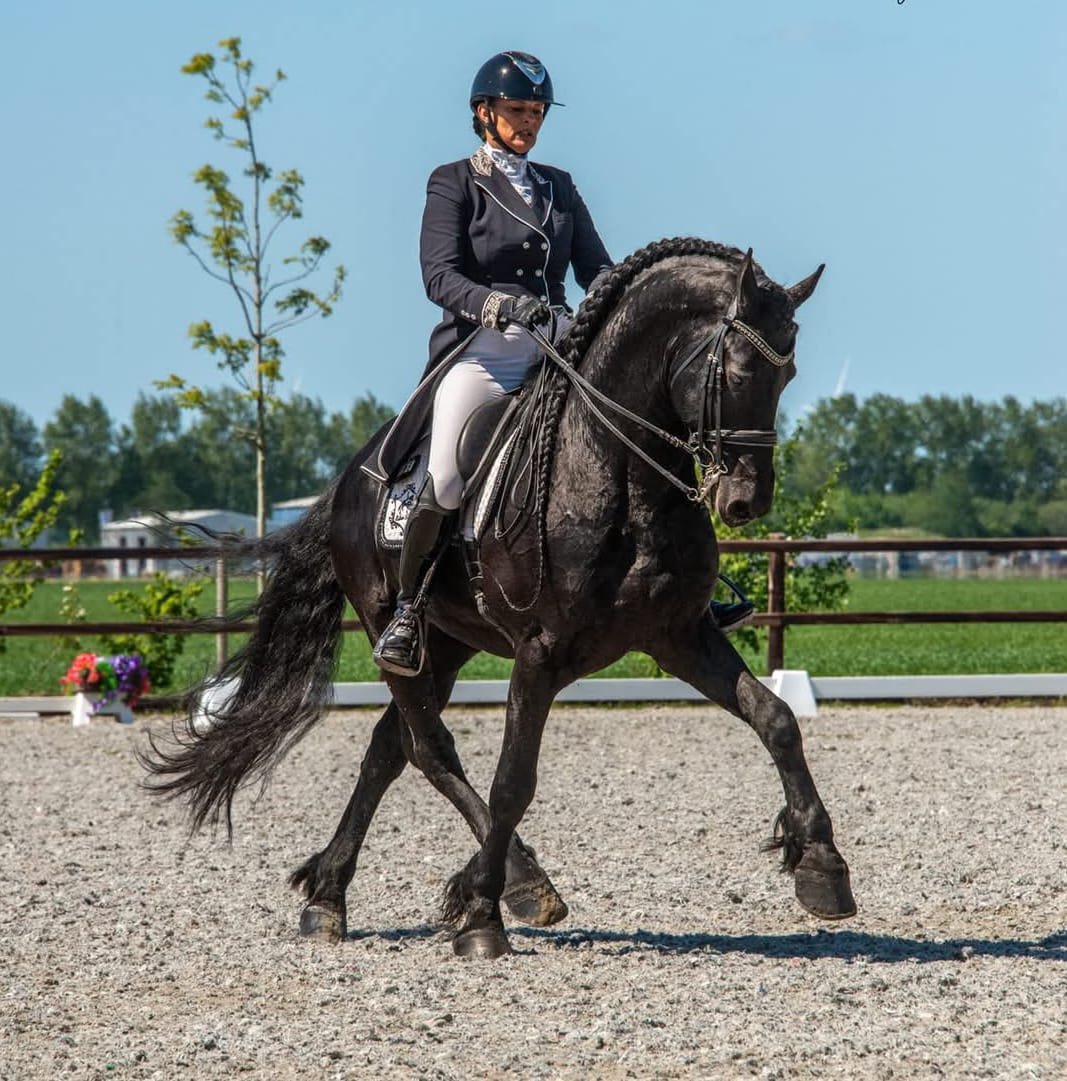Casey dankt zijn niet-Fries klinkende naam aan fokker Cees (‘Ceessie’ > Casey) de Boer uit Hoorn. ‘Hij en zijn vrouw Jet zijn de beste fans en (mede-)eigenaren die je je maar kunt wensen’, aldus Esther. ‘Ze zijn mega trots op hun fokproduct en als het maar even kan, zijn ze er bij als we starten.’ Esther kreeg Casey in de zomer van 2021 in training, nadat hij netjes tot de L2 was opgeleid door Martha van der Meulen. ‘Zij vertelde dat de Sterhengst een bijzonder karakter heeft, ontzettend snel en scherp en altijd op zijn hoede. Zo heb ik wel meegemaakt dat hij meteen nadat ik was opgestegen van iets schrok, 180 graden om zijn as draaide en daarbij zijn balans verloor. Tegelijkertijd is hij ongelooflijk talentvol. Het was aan mij om hem heel veel vertrouwen te geven, en dat lukt steeds beter.’