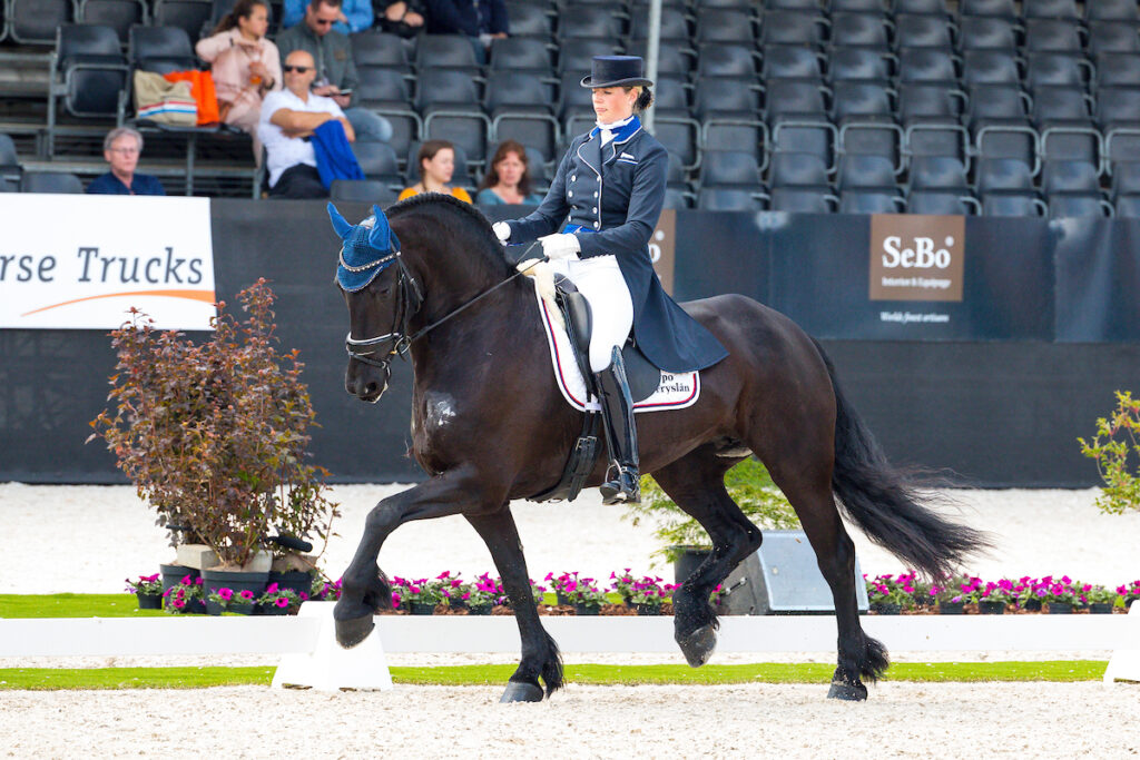 De dames Roling uit het Noordbrabantse Nieuwendijk zijn inmiddels helemaal in de ban van de Friese paarden. Naast dressuur zullen ze het komend jaar ook in de ring te zien zijn bij het tuigen en het mennen. Én ze hebben de eerste stappen gezet in de fokkerij. Ze vallen op stamboekhengsten die zelf ook in de sport gepresteerd hebben. ‘Met touwtjespaarden hebben we niet zoveel, ze moeten het voor de wagen of onder het zadel laten zien, dat vinden we belangrijker dan het laatste fraaie exterieur.’
