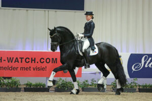 Epke 474 werd door Sabine van de Loenhorst voorgesteld en ze reed de Sport Elite hengst op een trens moeiteloos door de galopwissels. ‘Ruim en zuiver’, complimenteerde Van Hal. ‘Hij blijft in balans en gedragen en laat met gemak een hele lijn wissels zien.’
