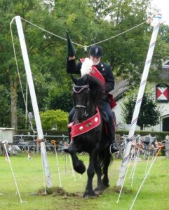 Steenhuis noemt een Fries bij uitstek een geschikt standaardpaard. Maar ook het incasseringsvermogen van een Fries kent grenzen … ‘Een collega standaardruiter, ook met een Fries, wilde eens kijken of zijn paard zou schrikken van de lans voor het ringsteken naast zijn hoofd. Bij gebrek aan een lans nam hij een paraplu. Dat ging prima totdat de paraplu plotseling openging … de ruiter belandde op de grond…’