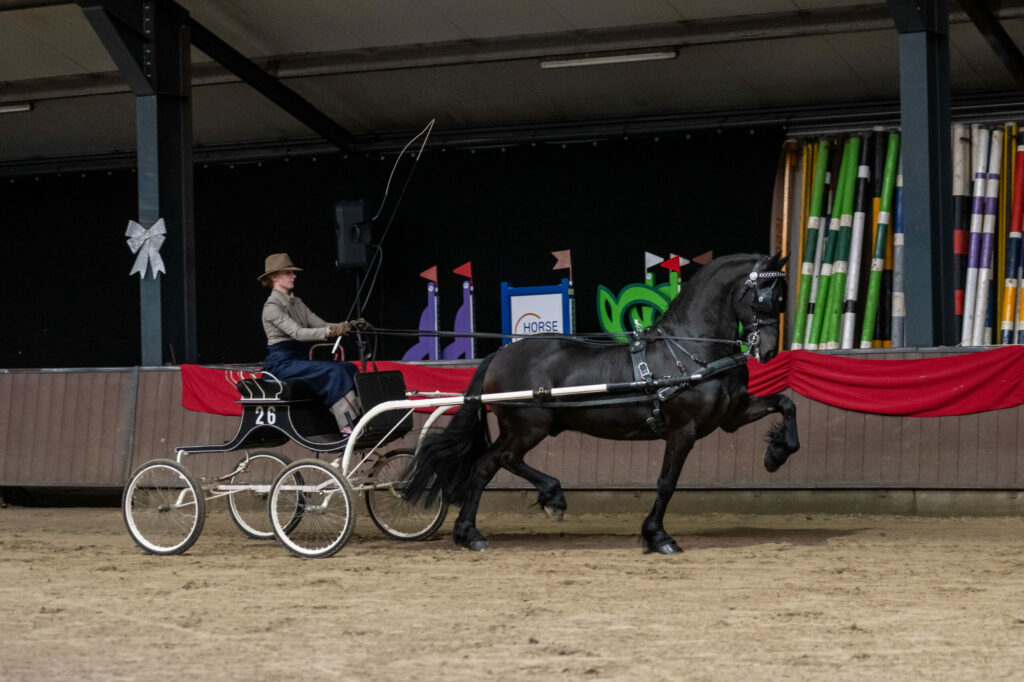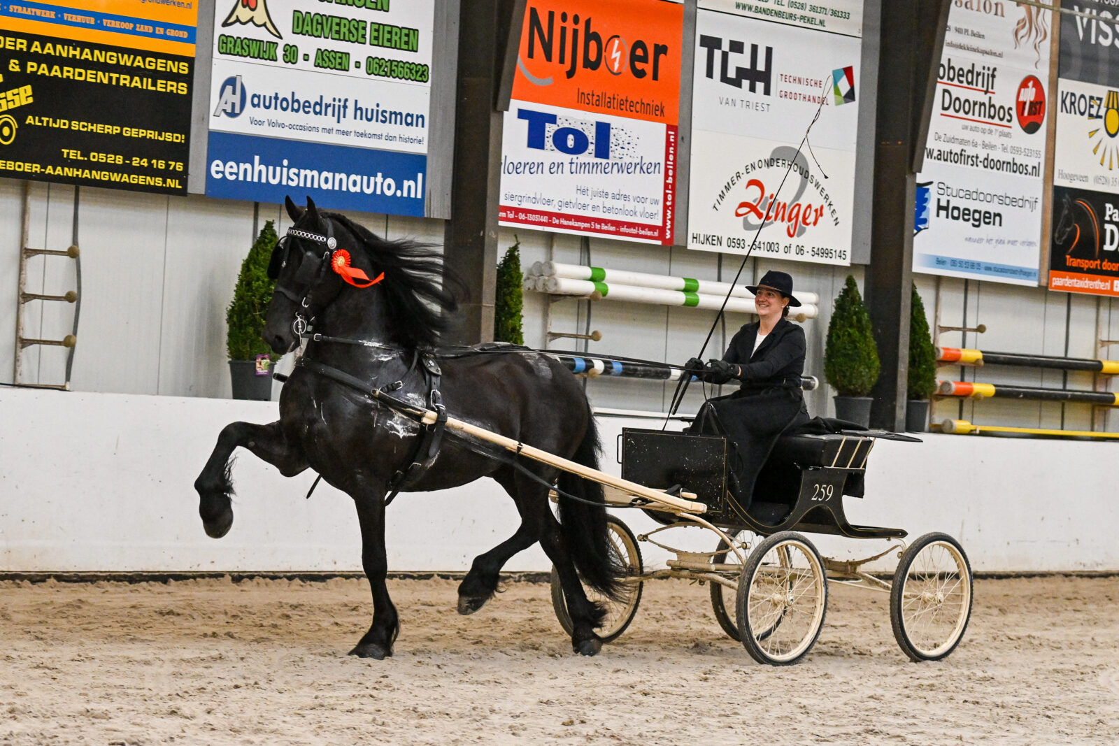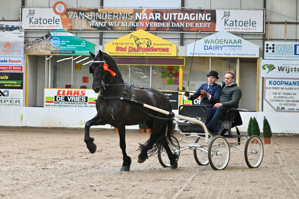 Tsjalle 454-zoon Durk kende deze zomer een minder leuke periode. Hij kampte met een blessure en is een aantal wedstrijden thuis gebleven. Maar tijdens Indoor Beilen kon hij weer mee en liep hij weer als vanouds. In handen van Wiesje Geerligs-van der Woude pakte hij de winst in de ereklasse, maar eventjes later ook in de damesklasse. “Het is heel fijn dat hij er nu weer is. Tijdens het stratenconcours in Rolde was hij er nog niet helemaal, maar nu is hij weer helemaal okay” zegt een breed glimlachende Wiesje die vervolgens nog complimenten uitdeelt aan het adres van groom Sam Oudhof die Durk ook meetraint.
