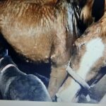 Hij kreeg een groot stalhalster als harnas om zijn borst en buik voor de veiligheid, zodat hij snel gepakt kon worden als de merrie boos werd. Maar dat gebeurde niet: de merrie liet hem haar uier aanraken, hij begon te drinken en de merrie snuffelde verliefd aan zijn staart, alsof hij haar pasgeboren kind was – wat een geweldig gevoel!