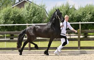 Nog een Ster tweede premie was er voor Rixt.v.E. Ster (Matthys 504 x Fabe 348). Ze mocht wat rijker in ras en behang, maar is correct gebouwd met brede, sterke lendenen, waarbij haar voorbeen hol is. ‘Ze waardeert zich op in beweging’, aldus Sabien Zwaga. ‘Ze stapt resoluut en draaft krachtig en opwaarts met voldoende techniek.’