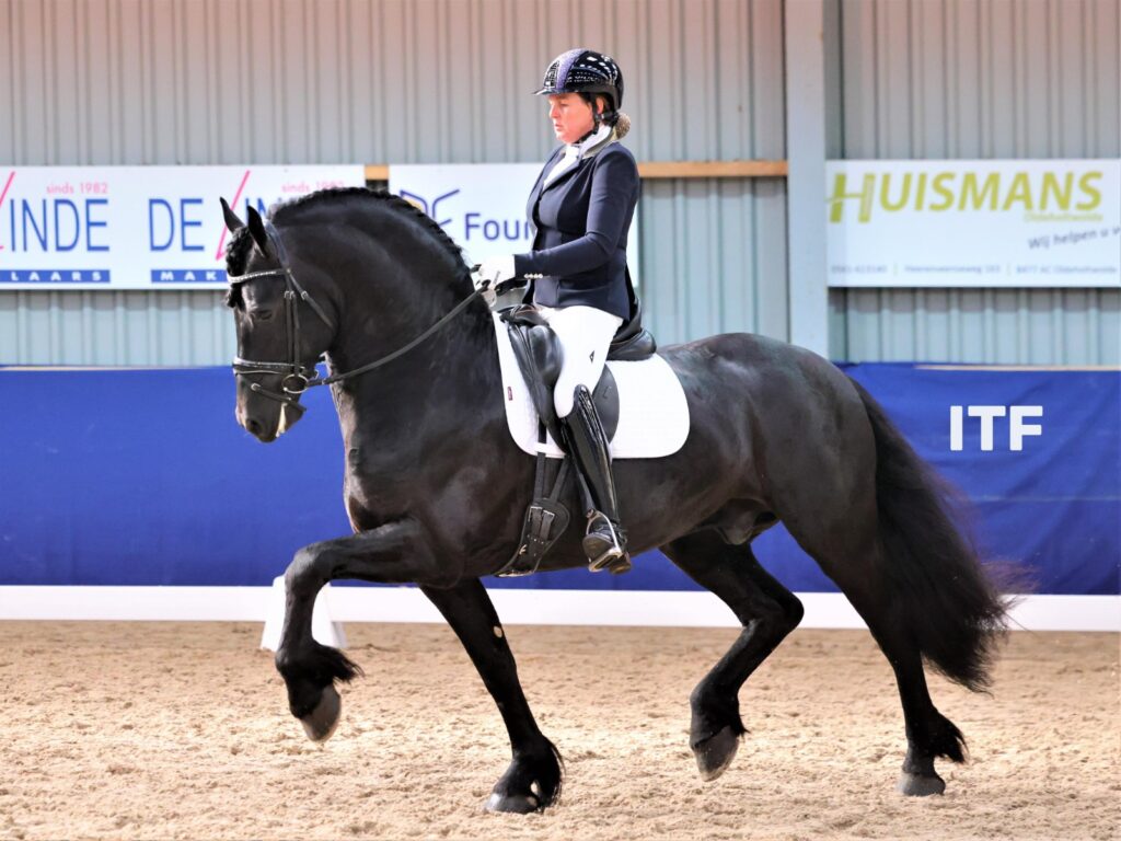 Na een dik jaar niet te zijn gestart in verband met de COVID-19 maatregelen waren daar ineens Evelien Spaan en haar Roaske ût ‘e Polder Ster Sport AA (Bikkel 470 x Wierd 409) die op de finaledag van het Alrako Dressuur Kampioenschap Fries Paard met een nummer 1 positie de middagproef van de klasse Z1 in gingen. ‘We zaten vol spanning de uitslagen te beluisteren en hadden wel gehoopt, maar niet echt verwacht dat ik bij de laatste 5 zou zitten’ vertelt de amazone uit Bleiswijk. ‘Ik was allang weer naar stal gerend om Roaske te vertellen dat we door waren toen mijn instructrice Marije van den Heuvel belde om te zeggen dat ik ook nog eens eerste stond!’.