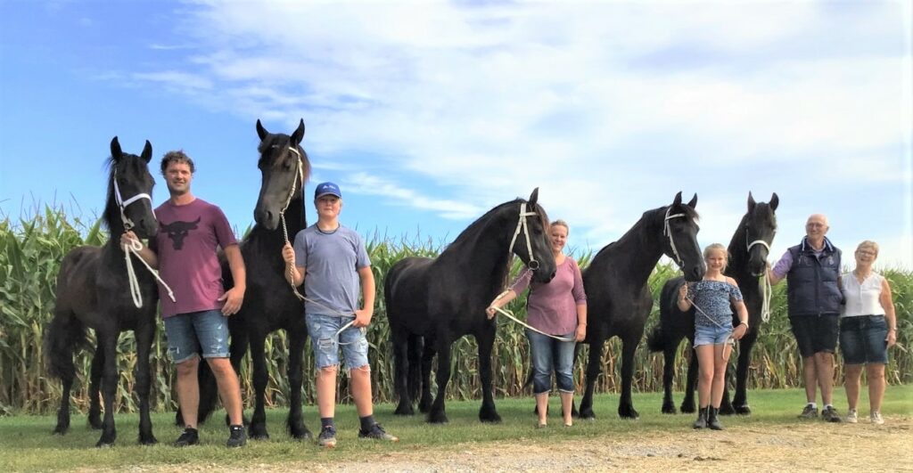Met Femke startte Sjoerd zo’n 13 jaar geleden met het fokken van Friese paarden, daarna kocht hij ook haar moeder Simke. ‘Ze fokte als een tierelier, dat zag ik wel, dus ik wilde haar heel graag hebben.’ Inmiddels is het aantal paarden flink gegroeid en worden er dit jaar zo’n 17 veulens geboren, uit merriestammen 214, 43 en 28 waar het vijftal uit voortkomt. ‘De moeder van Simke werd 23 jaar, een zesde generatie merrie uit deze lijn zou dus kunnen.’