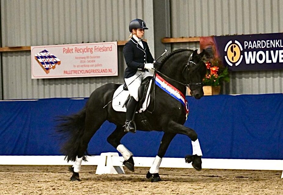 ‘Een sterk en mooi aangesloten achterbeen, mooi in balans, en een gesloten, gedragen galop’, met deze lovende woorden werd Mies Y. van de Sprong kampioen dankzij een mooie score van de gastruiter Mark van Leeuwen die de uitslag wat meer uit elkaar zette. De vierjarige Teun 505 nakomeling, wederom gefokt door Fleur van Kempen en met de fokker ook in het zadel, behaalde tweemaal 83,6 punten en dat werd dan ook de eindscore. Maxima van Stormëde Kroon AA (Alwin 469 x Tsjalle 454) en Sandra de Groot lieten 82.02 punten noteren op hun eindprotocol en bleven daarmee 2 punten voor op de nummer drie; Madam S.W. Ster (Omer 493 x Tjaarda 483) en Susan Wind.