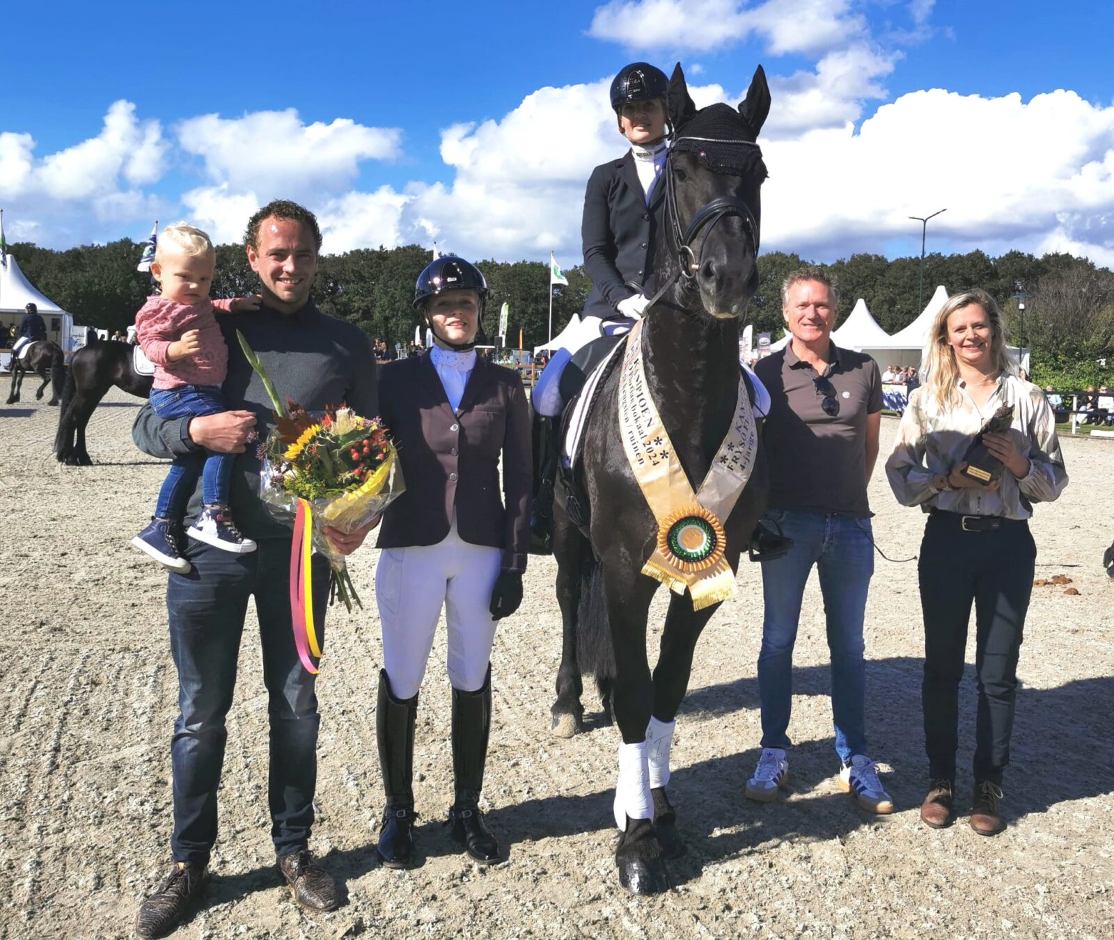 Murk 540 en fokker en amazone van Mies Y. van de Sprong Ster (Teun 505) Fleur van Kempen temidden van haar familie, medefokker Elle van Kampen en Steven Ebbens van Florian Horsefood en Emma Spoelstra van Fryso. Foto: Ingrid Truijens.