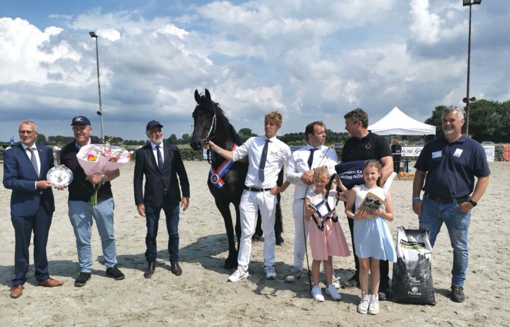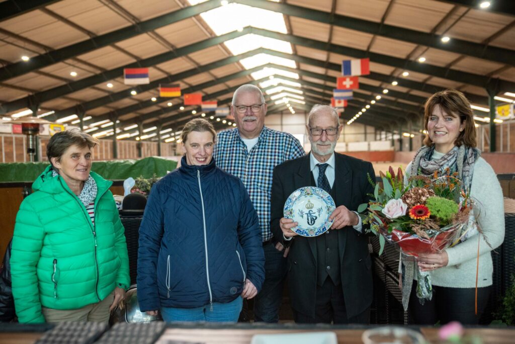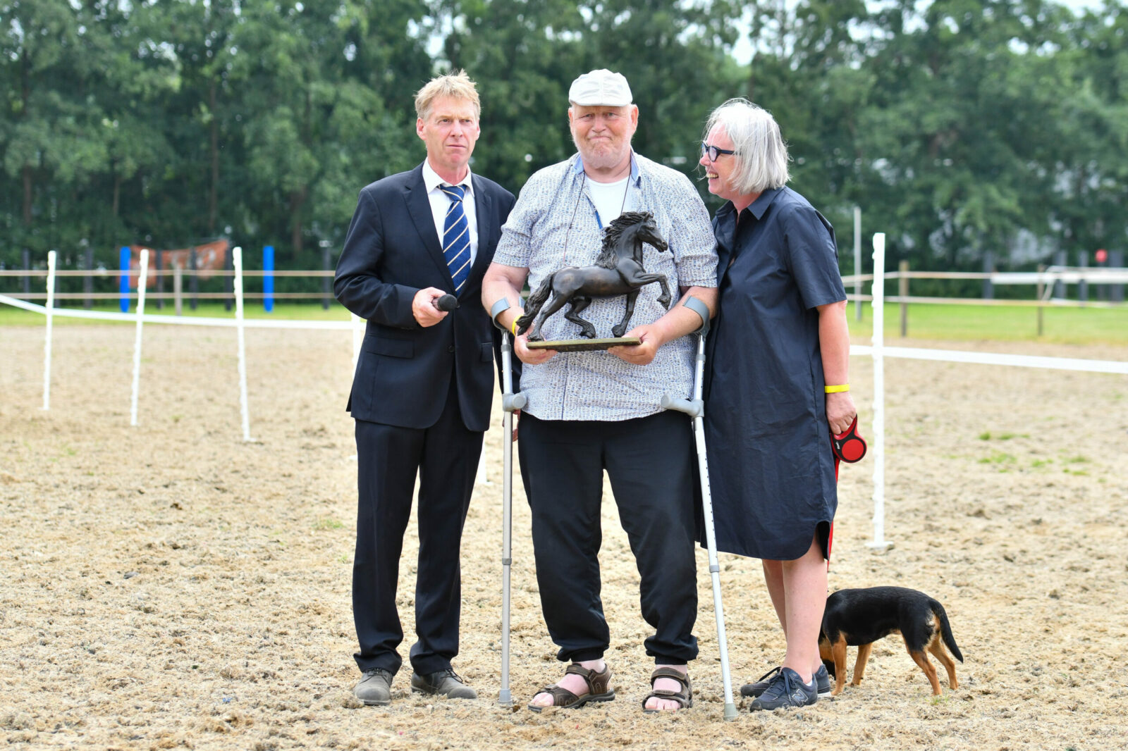 Het bestuur besloot dit jaar het bronzen beeld een andere bestemming te geven en zette de alom binnen de vereniging geprezen fokker en vrijwilliger Leo Spanenburg uit Boxtel in het zonnetje. “Leo heeft zo veel voor de vereniging gedaan. Wij geven hem dit beeld een jaar in het beheer” zo lachte voorzitter Jan-Hein Stadhouders. “Men kan het zien als een soort oevre-prijs. Want Leo is ook een verdienstelijk fokker met zijn ‘van de Ketting’-fokkerij. Tweemaal achtereen had hij al eens een algemeen fokdagkampioen. Zijn partner Sjouk Hoitsma zag gisteren trouwens haar merrie nog Voorlopig Kroon worden”, benadrukt hij nog maar eens.