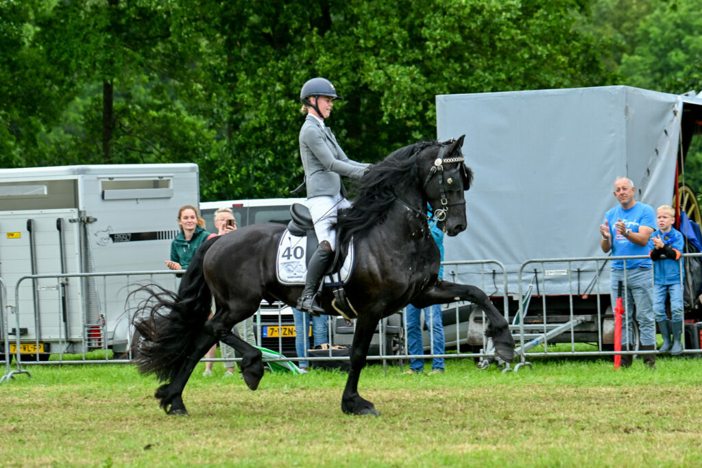Ook de animo voor het tuigen onder het zadel was groot met wederom een vijftal combinatie in het overrijden. Susan Wind liep een hele sterke wedstrijd met haar eigen Yfke SW (Tjaarda 483) waarbij de mooie houding direct opviel. In de overkamping moest ze echter Lieke Lueks met Rommert 498 (Norbert 444) langszij zien gaan. Rommert 498 knalde er nog even een paar spectaculaire rondes uit waarbij vooral de schoudervrijheid en het ruim wegzettende voorbeengebruik voor extra credits zorgde. Durk met Sam Oudhof werd derde nog voor Idsert van de Lits met Lisa Minkema en vervolgens Fokelien T.J. (Mewes 438) met Anne Rikst Eppinga.