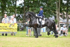 Verheugend is het aantal deelnemers in de Young Riders rubriek. Maar liefst elf jongeren kwamen stuk voor stuk de baan binnen. Elk op een eigen gekozen muzieknummer en met wat extra introductie om de toekomstige rijders nog wat beter te leren kennen. Beginnen in de tuigpaardensport in je eentje is lastig en daarom is vaak een opstap via een reeds actieve stal een pré. Doorgaans krijgen de jongeren paarden mee die al enige ervaring op de wedstrijden hebben opgedaan. Om de door u allen wel bekende reden is dat dit jaar even anders en verschijnen er in de young riders rubriek dit jaar ook veelal paarden die pas net beginnen. Dat hier talent tussen zit is nu wel duidelijk. In Wijnjewoude verscheen Merle Veurink opnieuw met haar eigen Waander 512 (Loadewyk 431) en net als in Diever en Siegerswoude weet de combinatie de aandacht op zich te vestigen. Waander 512 loopt zijn wedstrijd heel erg constant en is daarbij heel mooi verheven in het front. Zijn voorbeen kan hij ruim wegzetten en komt achter goed mee. Hij blijft daarbij elke ronde goed in balans en vooral belangrijk, hij doet dit alles in een tempo zoals de juryleden dit graag willen zien. Netjes en beheerst. Waander 512 kwam op de koppositie van deze rubriek en kreeg de iets minder luxe Vigo van der Wietze (Jasper 366) met Maaike de Jong naast zich op een tweede plaats. Anna Steenstra straalde uitgebreid na het vernemen van haar uiteindelijk verworven derde plaats met de immer enthousiast gaande Vincent VDK die qua tempo best een tandje minder mocht gaan. Jurre 495-dochter Hylkje fan ’t Kroese Beamke werd vierde nog voor de eveneens bijzonder talentvolle Fedde van de Waterhoeve (Omer 493) die pas zijn tweede wedstrijd in handen van JR Bouwman liep.