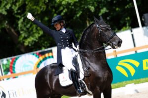 ’s Middags werd de Grand Prix gereden; het moment waarop Rémy Martin TKJ zijn debuut maakte op het allerhoogste niveau. ‘Ook over hem ben ik super tevreden’, luidt Hennie’s commentaar. ‘Superblij met dit debuut, want om alle lijnen in deze proef aan elkaar te rijden, is nog wel een uitdaging voor ons. We hadden wat beginnersfoutjes, helaas ook op de dubbel tellende zig-zag. Rémy schrok van iets dat op de tribune gebeurde waardoor ik de oefening niet mooi kon inzetten; dan loop je die hele lijn achter de feiten aan. Op de laatste lijn dacht hij dat hij moest halthouden – dat is immers ook zo in de Inter II … – en hij moest nog een piaffe doen. Daar was ik niet op bedacht.’
