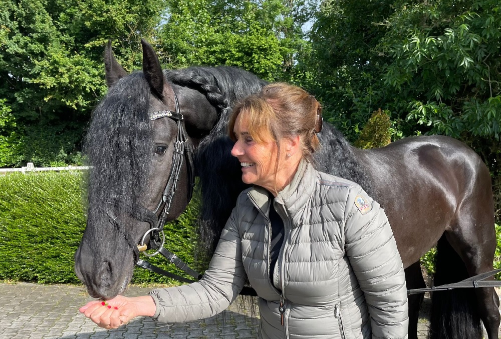 ‘Altijd al heb ik een zwak voor Friese paarden gehad. Ik heb zoveel leuke dingen beleefd met dit prachtige ras! Ik zette de Friezentrein op, een showteam waar we onder andere mee op het CHIO Aken hebben gereden en op Indoor Friesland. Telkens reed ik op een paard van een ander. Dus eind 2020 bedacht ik: “Nu wil ik er eentje helemaal voor mezelf!”’