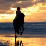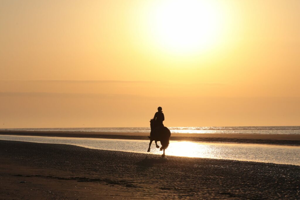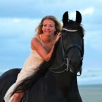 De inmiddels 18-jarige Grand Prix merrie maakt met haar eigenaar/amazone Karen Beijaard nog regelmatig een ritje over het strand. ‘Imke is met pensioen’, vertelt Karen. ‘Maar ze krijgt nog wel regelmatig beweging, dat houdt haar fit en ze vindt het heel leuk.’ Fotograaf Ingrid Truijens was erbij tijdens het ‘gouden uurtje’ bij zonsondergang toen Karen, deze keer in jurk en zonder zadel, haar strandrit met Imke maakte.