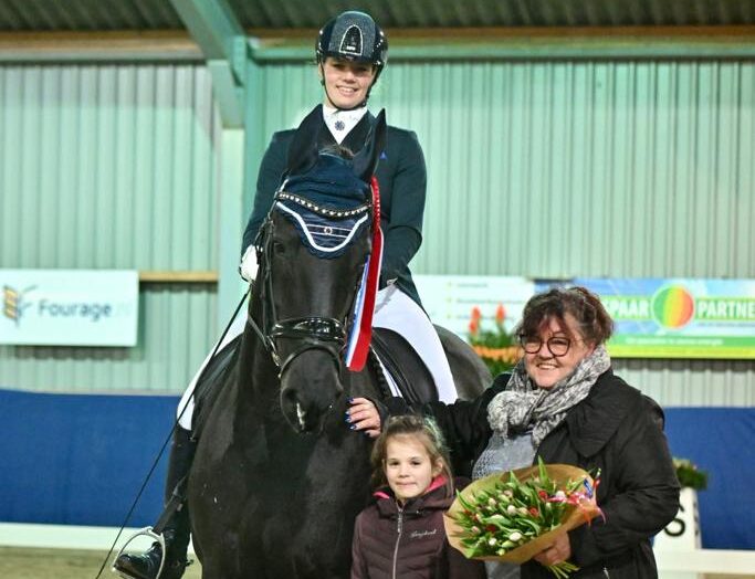 In Duitsland had Aframeeva alle reden tot lachen na afloop van haar proef. Knappe prestatie, foutloze proef, waarin de energieke 17-jarige hengst (Beart 411 uit Roaske fan de Praktykskolle Ster v. Gaije 295) er goed aan stond. De passage/piaffetour was aansprekend en hoewel de appuyementen en de stap voor verbetering vatbaar waren, lieten ze verder nergens punten liggen. En zo stond er 68,5% op het scorebord.