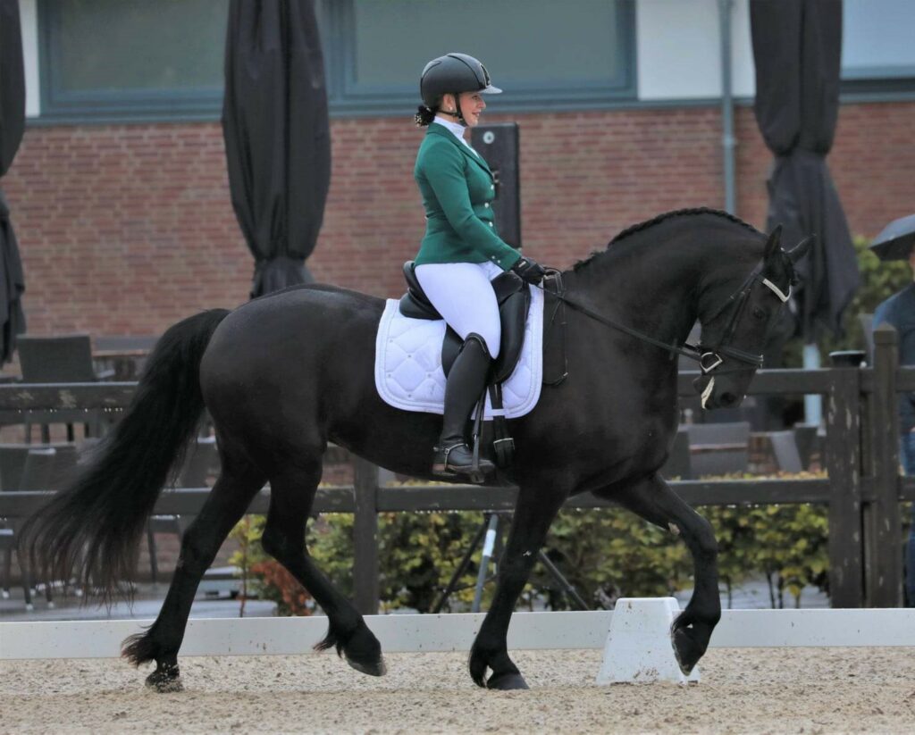 Het rijden met de nog jonge Friso ging ondanks de pijn toch heel goed. ‘Hij is eigenlijk maar een heel gewoon Fries paard, met heel gewone gangen. Ik moest en moet het echt hebben van het netjes rijden. Op het hogere niveau – en zeker in de subtop – is het geen paard dat 70% scoort. Toch waren we aardig op weg in het ZZ-Zwaar, met vallen en opstaan. Voor mij en voor Friso natuurlijk ook, was het de eerste keer op dit niveau. Dat viel wel even tegen… alles komt zo snel na elkaar en je moet zo precies rijden!’
