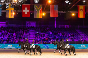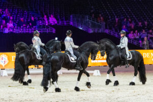 Van een viertal Friese hengsten je als liefhebber van Friese paarden nooit genoeg. Het is een mooie samenwerking tussen de ruiters en paarden waarbij je ogen tekort komt. De in het zilver gehulde dames van de Nieuwe Heuvel presenteren vier stamboekhengsten: de net definitief goedgekeurde Boet 516 met Sabine van de Loenhorst, dressuurtopper ook met een definitieve goedkeuring Arent 515 met Marijke Boelen in het zadel-, de fraaie Auwert 514 met Sandra Jansen en tophengst Tiede 501– gereden door Brandien den Hartog. Vier rasvertegenwoordigers met sport in hun genen. Vier gepassioneerde en ervaren amazones, wat een trots voor De Nieuwe Heuvel. ‘This power, power, power”!