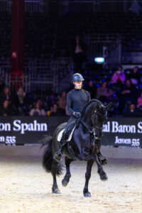 Natúúrlijk laat internationaal Grand Prix hengst Jeroen 535 een kür op muziek zien, dat kan hij immers als de beste, samen met Marc Peter Spahn. Op FEI-wedstrijden scoort dit duo al dik boven de 70% en houden ze zich staande tussen de warmbloeden. Sterke onderdelen van Jeroen 535: zijn oogstrelende pirouettes (op een dubbeltje!), appuyementen, wissels, piaffe… wat een elegantie en precisie. In een gecontroleerde uitgestrekte draf en onder luid applaus verlaat Jeroen 535 de piste. Wat een ambassadeur van het Friese ras. Chapeau!!