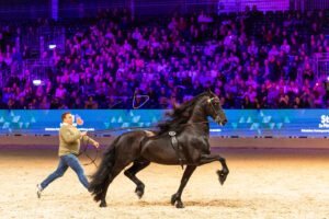 Stal De Mersken steelt de show met een speciale Friezentrein. Viertal Mans 543 met Iris Wijnstra, Martzen 521 met Jelmer Ketelaar en dan drie Okkema’s: Marieke rijdt Kanne 534 en Ela zit in het zadel van de Preferente Jehannes 484. En last but not least: Elger 536 met Age zelf, niet erop maar erachter. Hij laat Elger 536 shinen in de lange lijnen. Het allerbeste van Stal de Mersken komt hier voorbij….