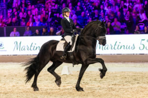 Het volgende duo komt alweer binnen voor een oogstrelende kür op L2-niveau: de zesjarige Martinus 539 met Mette Marit Eppinga in het zadel. Martinus 539 is de algeheel reservekampioen van de Hengstenkeuring 2024. Fijne passende muziek voor een getalenteerde en harmonieuze combinatie.