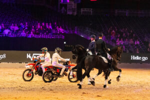 Twee motorcrossers komen vol gas binnen, met ronkende motoren. De pk’s smelten samen. De Friese hengsten naast de motoren en tussen de crossers in. Superbraaf en gefocust, terwijl de motoren grommen. Over een fantastisch karakter gesproken …