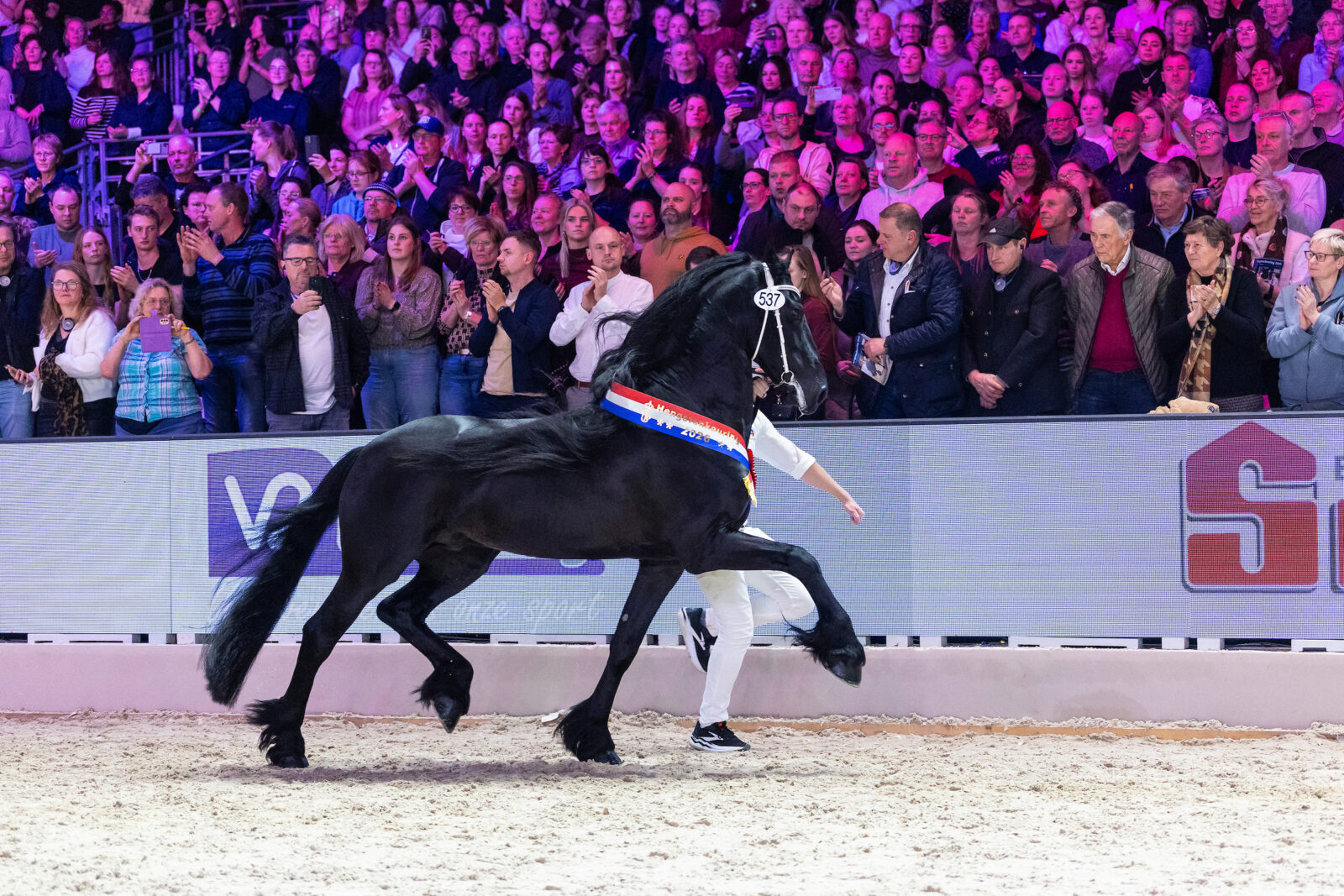 Tien hengsten gaan de strijd met elkaar aan in de kampioenskeuring van de jongere hengsten (rubrieken 4 t/m 9). Ze hebben zich allen van hun beste kan laten zien in hun individuele ronde. De jury heeft besloten wie er binnenblijven. Het spelletje van Bert de Ruijter met het publiek kan van start gaan … de hengsten staan één voor één bij de ingang.