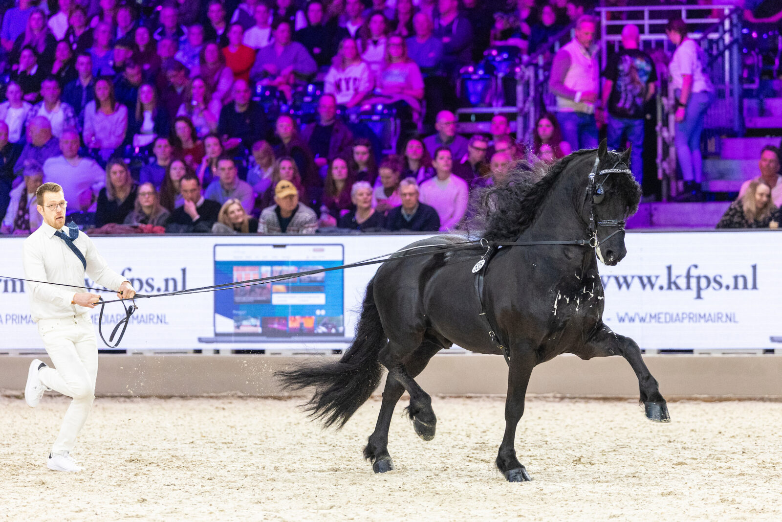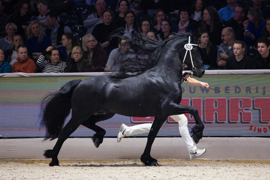 Martzen 521 staat er strak voor; hij is zo mooi opgedroogd! In draf loopt hij hier wat hoog in het kruis, maar onder het zadel van Jelmer Ketelaar laat hij zien hoe prachtig hij kan bewegen.