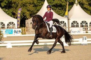 De inmiddels negenjarige merrie heeft alweer met amazone Hennie Roffel fraaie scores in de Lichte Tour laten noteren. In de Inter I haalden ze 63,08% en dat na een bewogen voorjaar en zomer, vertelt Elvera. ‘Renske Carmen heeft twee jaar geleden een ontsteking aan haar rechteroog gehad en is daaraan blind geworden. Afgelopen voorjaar begon dat oog te irriteren en de dierenarts heeft het eruit moeten halen.’
